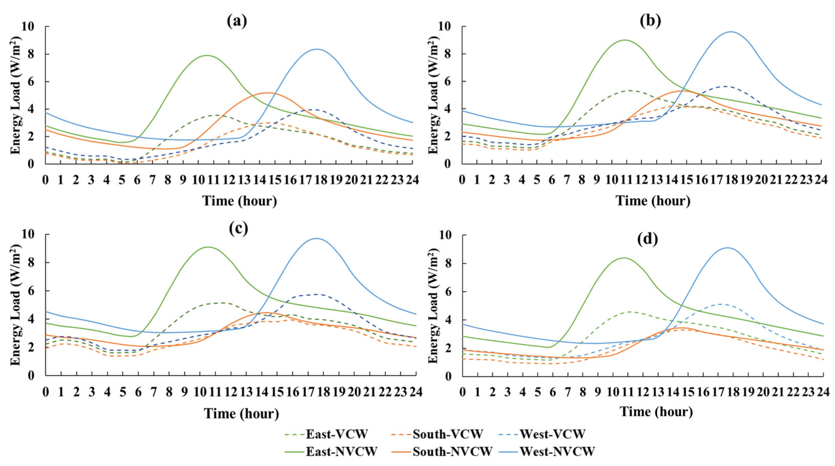 Diurnal energy load PNVCW and PVCW for typical summer days in four U.S. cities: (a) Lincoln, 12 July 2016, (b) Las Vegas, 4 July 2016, (c) Tucson, 6 July 2016, and (d) Austin, 7 July 2016. Each plot compares the VCW vs. NVCW’s cooling load for east-, south-, and west-facing façades.