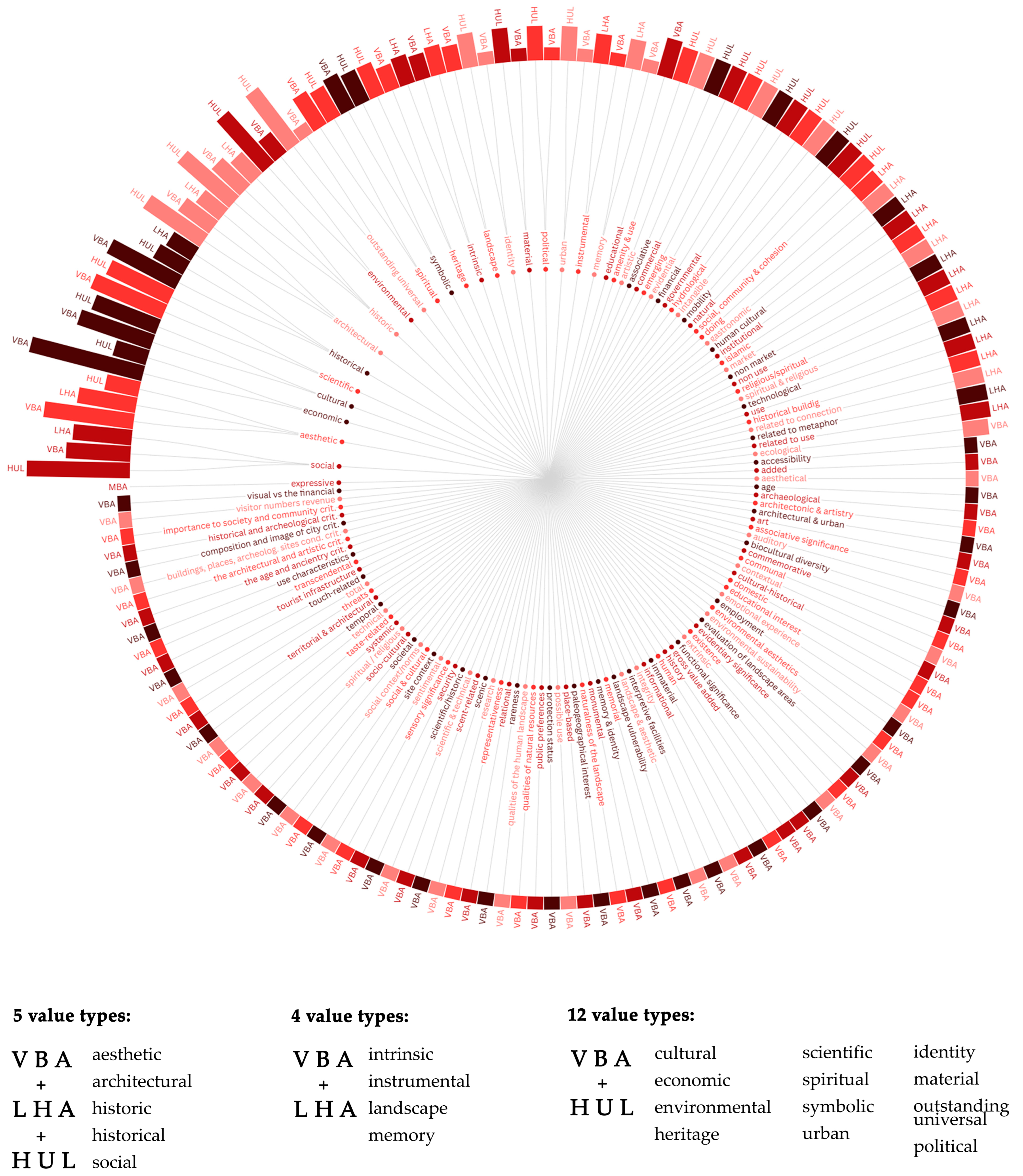 | Rey-Perez et al. [177] | Six value types included: 1. Architectural; 2. Cultural; 3. Emerging; 4. Environmental; 5. Heritage; 6. Outstanding universal. |