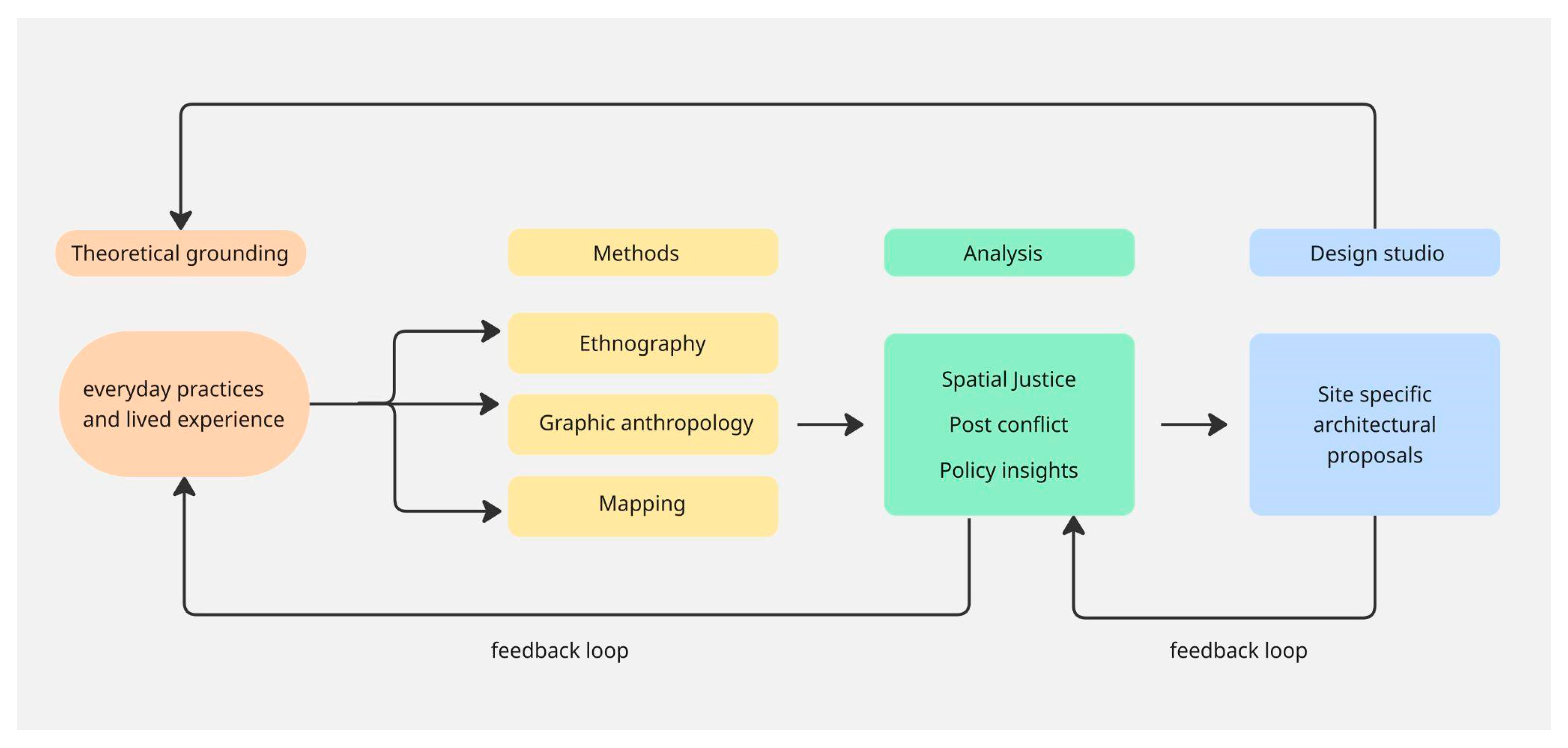 Rather than operating as parallel or loosely associated references, the theoretical concepts mobilised in this study function as an integrated analytical framework that connects urban theory, ethnographic method, and architectural design practice. Theories of everyday practices provide the grounding for ethnographic observation and participatory engagement, concepts of the right to the city and spatial justice establish the normative and evaluative lens through which everyday conditions are interpreted, and post-conflict urban dynamics frame the socio-spatial constraints within which architectural action takes place. Together, these perspectives inform the design studio’s methodological structure, shaping how knowledge is produced, translated into architectural propositions, and assessed in relation to social, spatial, and ecological impact (Figure 2).