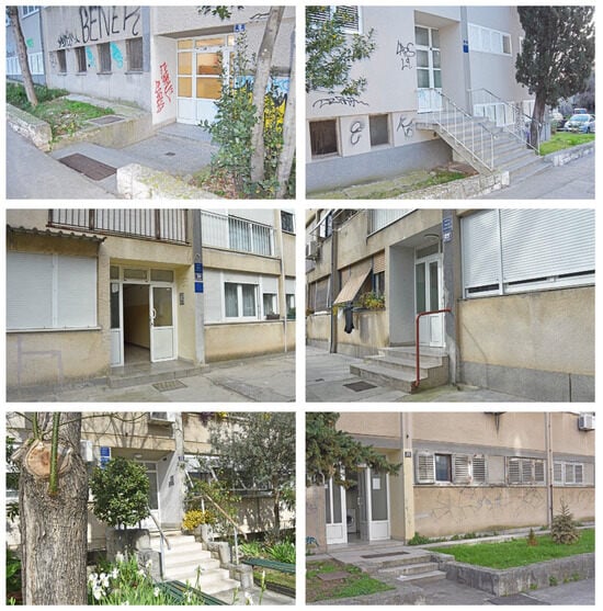 Different entrance designs in URBS 1 buildings across various locations in Split. Source: author’s archive.