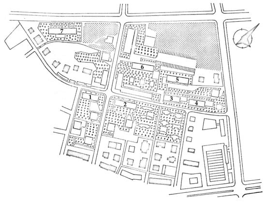 Layout of the residential area on XX. Dalmatinske divizije Street. The URBS 1 buildings in the residential area along Osječka Street are marked with the numbers 1–7. Source: Ref. [14] (figure no. 17). Marks 1–7 added by the authors of the article.