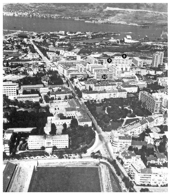 Residential area along Osječka Street, shortly after it was built. The URBS 1 buildings in the residential area along Osječka Street are marked with the numbers 1, 2 and 6. Source: Ref. [50]. Marks 1, 2 and 6 added by the authors of the article.