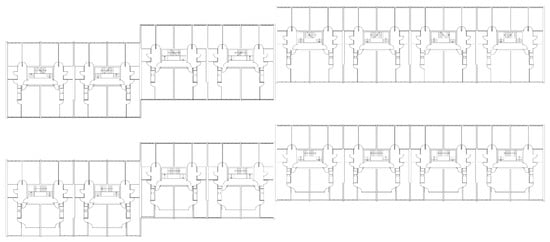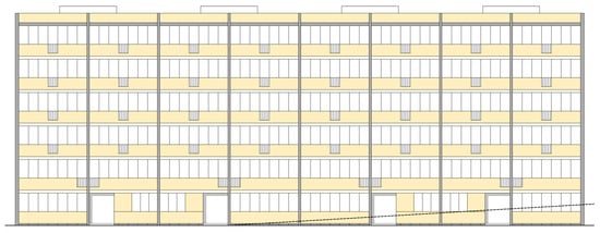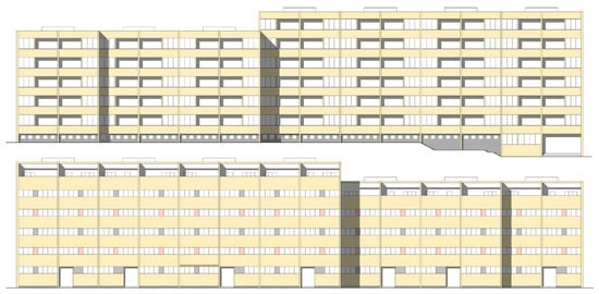Three URBS 1 standard buildings by architect Josip Vojnović were built in the Skalice residential district. These are the buildings at 23, 25, 27, 29 Put Skalica Street (building no. 8); at 31, 33, 35, 37, 39, 41, 43, 45 Put Skalica Street (building no. 9); and at 8, 10, 12, 14 Table Street (building no. 10) [27,28,29]. The building footprints and heights were determined by the conceptual urban planning project [54]. Buildings no. 8 and no. 10 have a rectangular floor plan, while building no. 9 is longer, so its floor plan is segmented into three rectangular parts. The buildings are six storeys in height, in accordance with the preliminary urban design (Figure 18 and Figure 19).
