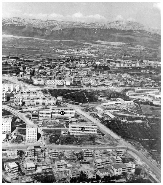 After World War II, Split became the cultural, economic and administrative centre of Central Dalmatia. As a result, its population started to grow rapidly due to the immigration of people from the surrounding areas. Since the city had the function of a military port, this also entailed the immigration of military personnel from other parts of Yugoslavia at the time. In 1951, Split adopted the Directive Regulation Basis of the City of Split, which determined the network of city roads that demarcates residential areas [1] (p. 105), [35]. According to the CIAM’s guidelines, urban planning regulations for residential settlements were drawn up in the 1960s, and the settlements themselves were constructed by the end of the same decade.