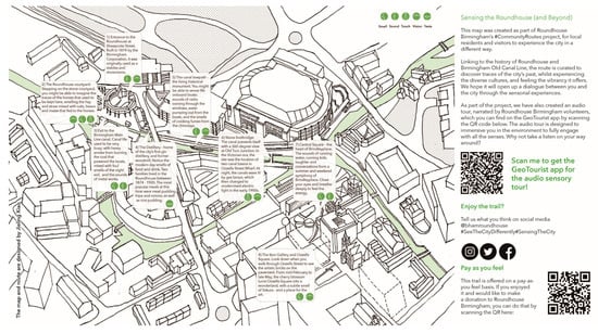 The Roundhouse Birmingham (RB) is a grade 2 listed crescent-shaped heritage building on Sheepcote Street Birmingham that reopened in 2019 (see Figure 2). The building, once used as a depot, is repurposed to have a restaurant, an exhibition space, a meeting space, and a distillery. It is at the quieter end of an old canal, a 10 m walk from the attractions around Brindley Place. The sensory trail was commissioned as one of their four community trails. It is presented through a map and an audio format via GeoTourist to allow self-guided walking following the trail. The audio tour was narrated by a local volunteer and used soundtracks of 19th century environmental sounds from the sound library created by the British Library to offer a historic atmosphere. The trail started from the gate of the Roundhouse, passing through the building, and moving onto the canal-side with a few surrounding attractions, including Birmingham Arena and Sealife Centre, the old Birmingham canal junction, and the Brindley Place clock tower (see Figure 3).