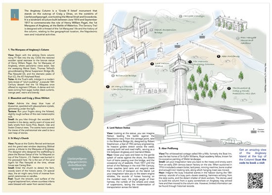 The Marquess of Anglesey’s Column (AC) is also a grade 2 listed heritage building, standing on the top of the UNESCO Site 13 Geopark Geomon, affording unrivalled panoramic views of Anglesey and Snowdonia (see Figure 4). The site’s entrance is hidden among a quiet residential area. Apart from the column, there is cottage building that has been turned into a café and an interpretation center to facilitate learning about the history of the Battle of Waterloo, where the Marquess fought courageously and lost his leg. The sensory trail was created as part of a research project funded by the UK prosperity fund with the main purpose of bringing more people to the site. The trail started with the column and then connected to the surrounding heritage places, which are also associated with the first Marquess (see Figure 5). The sensory features are derived from either historical documents or the site.