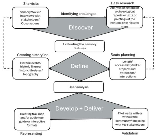 A series of questions can be asked to facilitate the reflections at each stage to ensure the process is valid [43]. For example, at the discover stage, key questions to ask for reflective designers could include the following: What are the constraints of the project? What problems are you solving? What are the needs of stakeholders and users? Through the retrospective reflection on creating two sensory trails (see Table 1), this paper aims to produce outcomes that extend beyond individual experience, offering a framework that can guide designers and heritage practitioners in developing inclusive, sensory-rich visitor experiences.