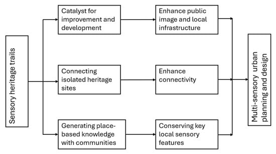 A conceptual framework of sensory heritage trails as place-based spatial strategies to inform urban policies and design through three pathways.