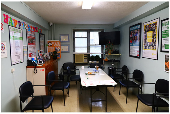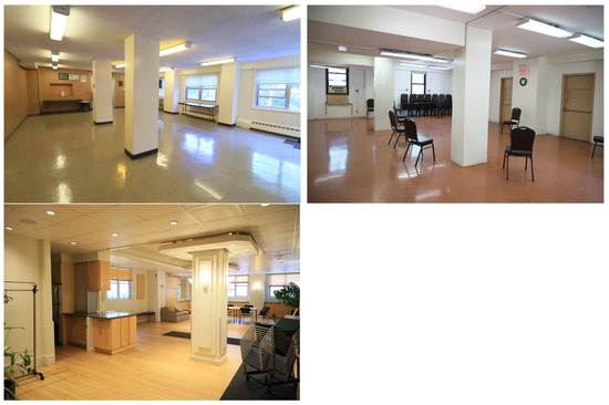 All visited NORC centers were accessible except for two developments. These spaces were generally more spacious and brighter in cooperative buildings (Figure 3 and Figure 4). One NORC had recently renovated its premises with older people’s needs in mind. The NORC that served several developments was located on the top floor of a new building, with bright, inviting facilities and an outdoor patio. However, several NORCs had columns in the middle of the activity rooms, rendering these spaces less functional (Figure 4).