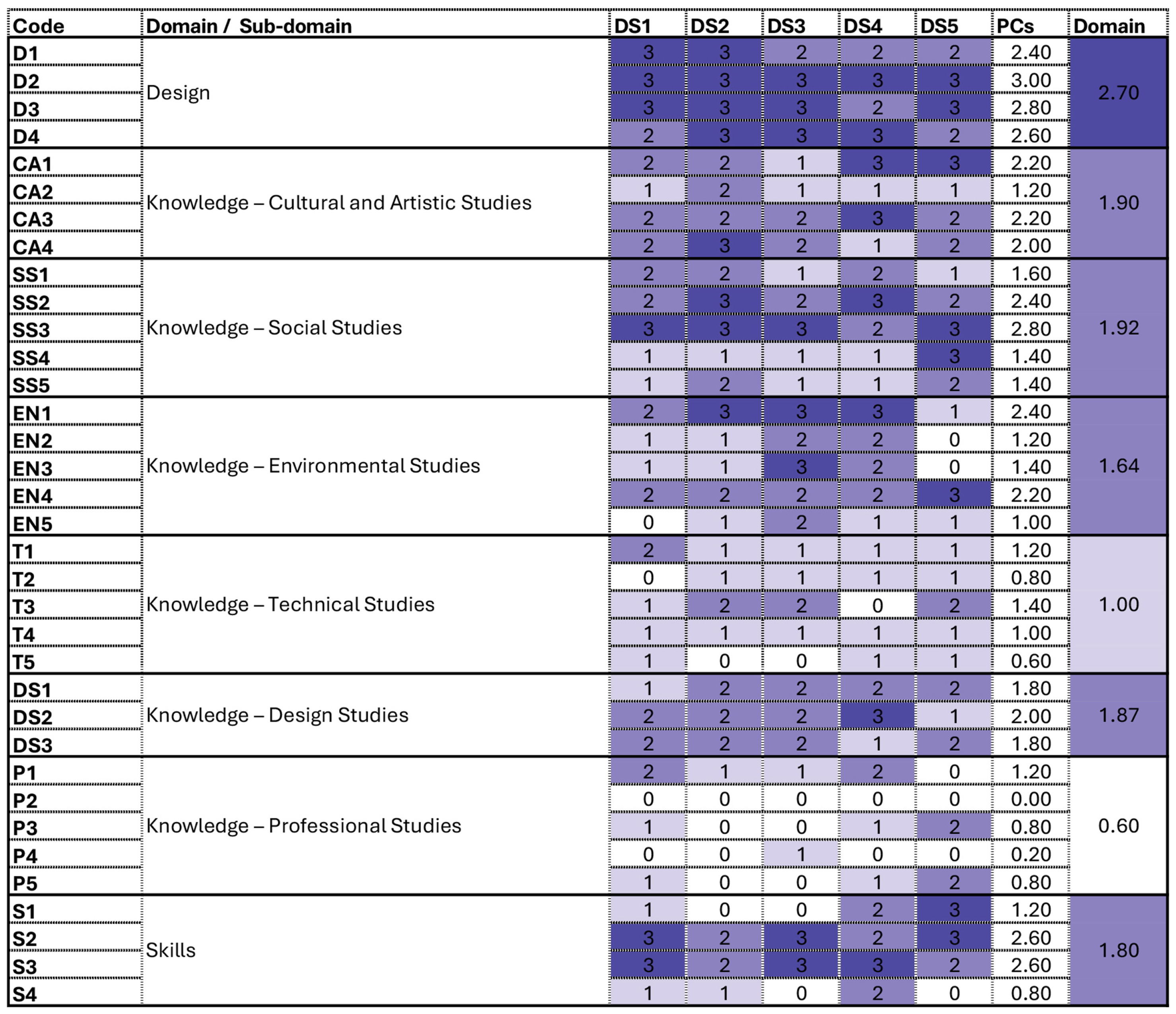 | DS1 | Knowledge—Design Studies | Knowledge of design theory and methods. |