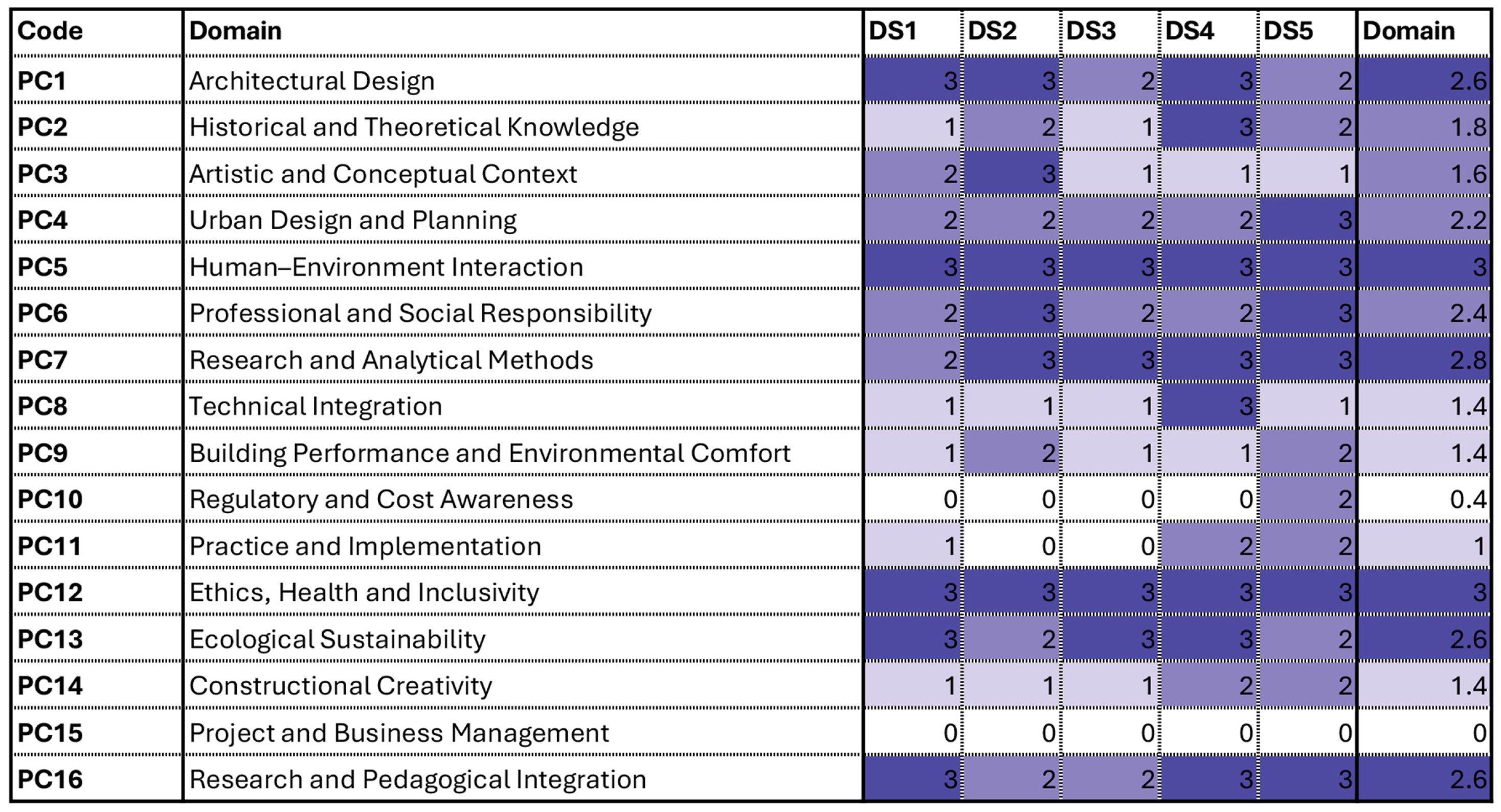 | PC16 | Understanding of research and pedagogical methodologies, including transdisciplinary knowledge action and transferability as inherent parts of architectural learning. | Research and Pedagogical Integration |