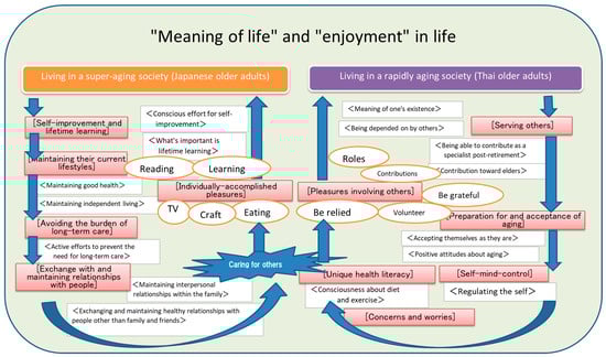 This study aimed to identify the elements of pleasure and fulfillment in older adults living in the super-aged society of Japan and those living in the rapidly super-aging society of urban and rural Thailand by comparatively analyzing their narratives. Thai older adults tend to live in a much more religious Buddhist society compared with Japanese older adults, but with relatively underdeveloped infrastructures. We expected that by comparing the narratives of older adults in Thailand with those of Japanese older adults, we would obtain insight into the essential elements for maintaining independent living and improving quality of life in the older adults of the two countries.