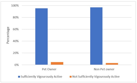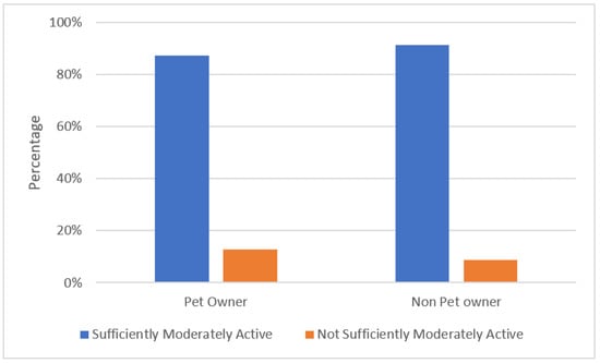 Interestingly, an early study, in 2006, by Thorpe et al. [] found that dog owners differed in terms of physical activity compared to those non-pet owners, however those pet owners that were not dog walkers did not differ from non-pet owners. Furthermore, a study by Albright, Cui, and Allen [] found that dog owners had better subjective health and were more likely to take part in exercises such as walking than their non-pet owner counterparts. Shibata et al. [] reported how important physical activity was in older adults and that those pet owners who had dogs were more likely to be sufficiently active than non-pet owners. For example, a survey in 2019 in Northern Ireland highlighted that a majority of pet owners were dog owners, 31% higher than any other type of pet []. This indicates that the type of pet may have an influence on the levels of physical activity, which should be examined in any further longitudinal studies. However, a similarity with this study is that pet owners were more likely to be sufficiently active. Overall, while significant differences may be evident in this study, both groups had relatively low moderate to vigorous physical activity levels, therefore pet ownership may not necessarily explain higher levels of physical activity. While the secondary analysis showed significant differences similar to the studies discussed above, there were slight differences in results between our study and these previous studies. For example, different styles of questions were asked with regard to pet ownership and type of pet, and differences were evident in the age range allowed in an age study, as each country had slightly different ages for their older adult sample.