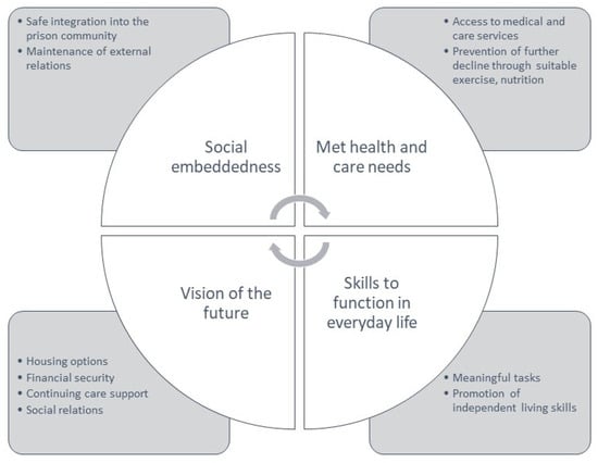 As Bowling pointed out, successful ageing is not so much about health, but about maximizing one’s psychological resources [37]. A positive outlook is linked to resilience [38] and better mental health [39]. In the model of successful ageing that we propose (see Figure 1), a positive vision of the future is interlinked with the other key elements of successful ageing. Being embedded in social relations enables people to be more optimistic about the future, but also vice versa. The motivation to do something for one’s health and maintain daily living skills can be derived from hopes for a dignified life beyond prison.