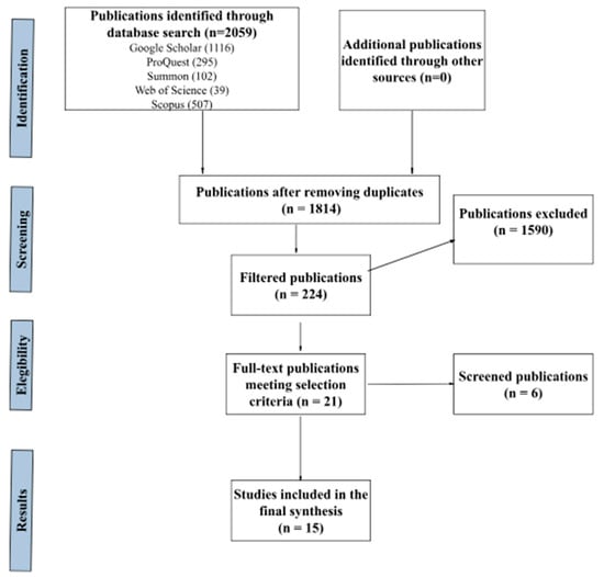 The search was performed in the databases Google Scholar, ProQuest, Summon, Web of Science, and Scopus, with the search completed on 30 December 2023. The search was limited to the last 10 years, and publications were included if they were in English or Spanish (criteria applied in the initial search). Additionally, in the ProQuest and Summon databases, the search was limited to full-text scientific journals.