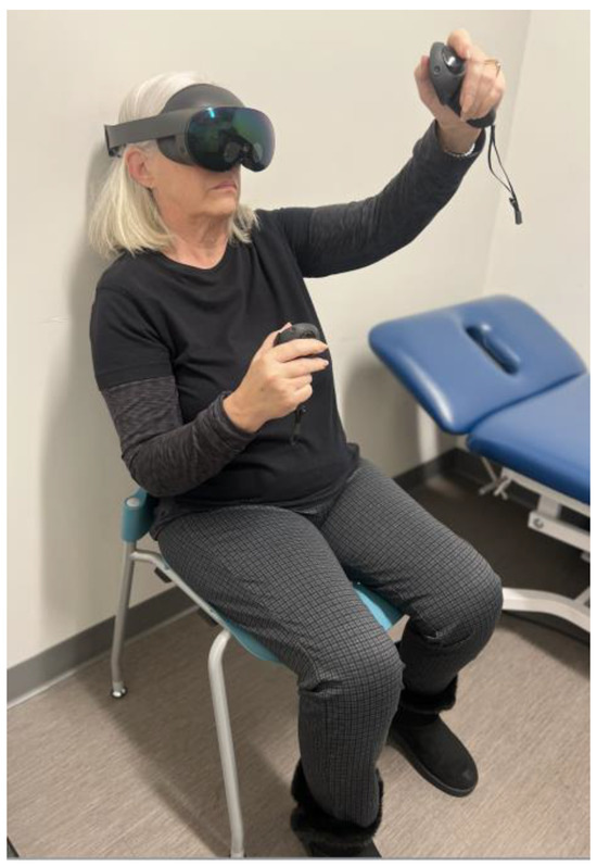 Participants were a convenience sample. The aim was to recruit between 10 and 20 participants, which is in alignment with sample sizes obtained in previous mixed method immersive IVR studies on initial feasibility and usability [18,32,33]. Inclusion criteria were older adults who 1. were 65 years old or older, 2. were living in the community (i.e., not institutionalized nursing care), and 3. demonstrated intact binocular vision, determined through the task completion of reading the Informed Consent document. The exclusion criteria of this study followed the Meta Quest Pro manual recommendations (https://www.meta.com/quest/safety-center/quest-pro/#manuals accessed on 19 September 2023) along with exclusions due to vestibular complications [26]. The exclusion criteria were as follows: (1) history of vertigo, dizziness, or motion sickness, (2) history of seizures or epilepsy, (3) contagious skin and eye conditions, (4) light sensitivity, (5) use of hearing aids, and (6) pacemakers or defibrillators.