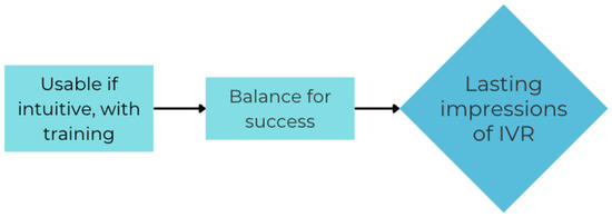 When examining overall implementation, the theme of “Lasting impressions were related to the perceived implementation”, was based on a combination of the apps used and their learning experiences. Thus, Figure 2 visually represents the prior two themes of decision-making for usability, training, and the consideration of the balance with engagement for a successful session, which may impact the overall impressions. Qualitative results included a mix of negative and positive perceptions, ranging from reports of overly complicated apps to reports of the apps being clever, fascinating, interesting, and fun. Participants who reported positive experiences also found IVR to be engaging and practical. Participants who reported an overall negative experience found IVR to be impractical and limited. Despite participants recognizing that there are limitations to IVR, there were positive responses. These responses reflected only one session of IVR training, which may not have been sufficient time to ensure usability among older adults. As previous literature suggests, learning new tasks of engagement is beneficial for productive aging but must be incorporated into everyday routines [5].