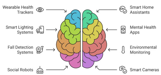 Smart home technologies (SHTs), as illustrated in Figure 1, utilize interconnected devices, including motion sensors, ambient monitors, AI-driven analytics, and telehealth interfaces, to provide real-time support for older adults [7,8]. Leveraging IoT architectures, these systems monitor daily tasks, track vital signs, and detect behavioral changes, such as reduced physical activity, which may signal mental health concerns like depression [4,9]. However, adoption is hindered by usability challenges, including complex interfaces, small text sizes, and overwhelming data presentations, which discourage consistent use [10]. Technology-related anxiety, such as fears of device malfunction or data breaches, further inhibits engagement, especially among less tech-savvy users [3,11]. Accessibility barriers, including physical impairments (e.g., reduced motor skills, sensory deficits) and limited internet access in rural areas, exacerbate these challenges [12,13,14]. Privacy concerns regarding continuous data collection raise issues of surveillance, autonomy, and data ownership [15,16]. Distrust in “always-on” sensors, particularly when data usage policies lack transparency or when mental health monitoring carries stigma, compounds these concerns [17]. Ethical considerations, such as ensuring user consent and agency, are critical in addressing these privacy issues. Economic constraints, including device costs, subscription fees, and home modifications, pose additional barriers, especially for older adults on fixed incomes [18,19]. Despite these challenges, well-designed SHTs grounded in ethical principles—such as autonomy and beneficence—can reduce psychological stressors related to isolation and chronic conditions [20]. Research underscores the potential of ambient-assisted living systems, AI-enabled reminders, and remote counseling to complement human support when usability, accessibility, and ethical concerns are addressed holistically [21].