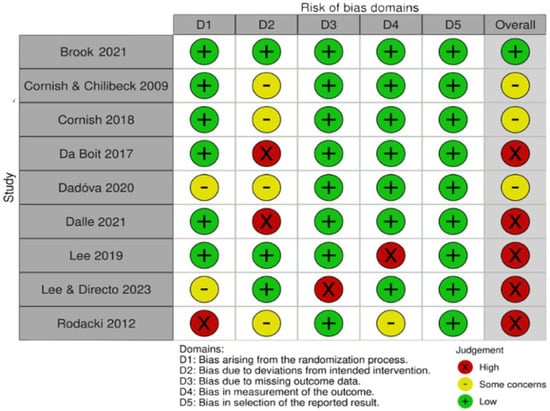 - Higgins, J.P.T.; Savović, J.; Page, M.J.; Elbers, R.G.; Sterne, J.A.C. Assessing Risk of Bias in a Randomized Trial. In Cochrane Handbook for Systematic Reviews of Interventions Version 6.3; Updated February 2022; Cochrane: London, UK, 2019; Chapter 8; pp. 205–228. [Google Scholar]