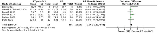 | Kamolrat et al. [81] | DB EG: RT + Ω-3 CG: RT + PLA | 7 (0) 6 (0) | 66.9 | 24 (2 × 12) | T-Ω-3: 4 EPA: 1.7 DHA: 0.4 | Olive oil: 4 | NMF (LB) PF (WA) | 12 |