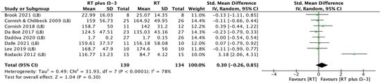 | Lee et al. [82] | DB EG: RT + Ω-3 CG: RT + PLA | 10 (0) 10 (0) | 65.7 | 16 (2 × 8) | T-Ω-3: NR EPA: 2.1 DHA: 0.72 | Safflower oil: NR | NMF (UB) PF | 8 |