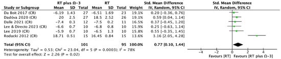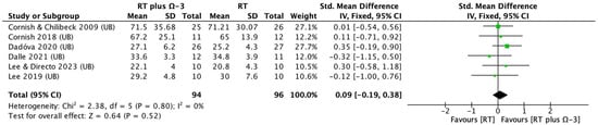 | Cornish et al. [46] | DB EG: RT + Ω-3 CG: RT + PLA | 11 (100) 12 (100) | 71.2 | 36 (3 × 12) | T-Ω-3: 3 EPA: 1.98 DHA: 0.99 | Omega-3-6-9 blend: 3 | MM NMF PF (WA + UG) | 12 |