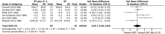 | Physical function (WA) | 6 | 166 | SMD. Random. | 0.03 (−0.58, 0.63) | 0.93 | 72% |