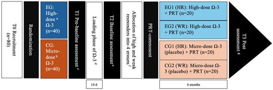 | Dadóva et al. [48] | DB EG: RT + Ω-3 CG: RT + PLA | 27 (100) 26 (100) | 71 | 32 (2 × 16) | T-Ω-3: NR EPA: 0.125 DHA: 0.105 | Sunflower oil: NR | MM NMF PF (CR) | 16 |