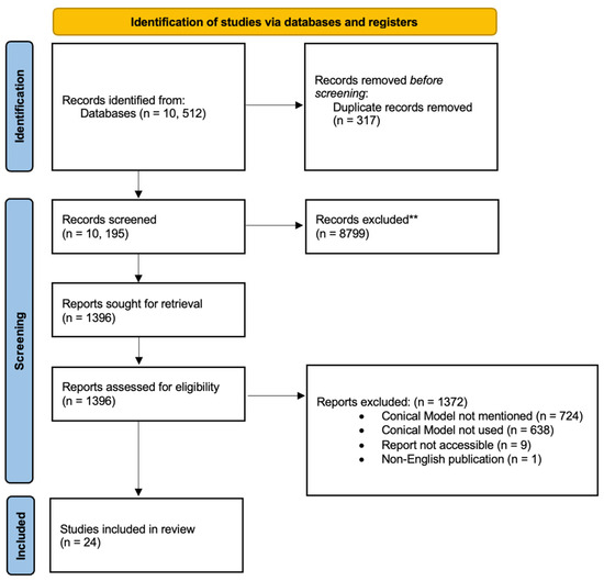 Chicago/Turabian StyleKalu, Michael E., Daniel G. Rayner, Izma Ali, Angela Bilic, De Silva Tharani, Jake Lee, Anthony Samy, Vidhi Bhatt, Caitlin McArthur, and Vanina Dal Bello-Haas. 2025. "Application and Implementation Gaps in the Conical Model for Older Adults’ Mobility: A Scoping Review" Journal of Ageing and Longevity 5, no. 2: 18. https://doi.org/10.3390/jal5020018