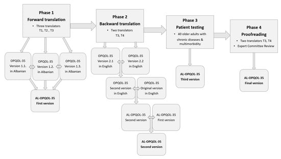 The Older People’s Quality of Life Questionnaire (OPQOL-35) is a validated tool used to measure quality of life in the older people in many countries. The study describes the linguistic validation, cultural adaption, and pilot testing of the Albanian version of the OPQOL-35 (AL-OPQOL-35) in older adults, confirming its internal consistency and reliability. The process of linguistic validation, cross-cultural verification and adaptation of the AL-OPQOL-35 questionnaire went through four stages: forward translation, backward translation, patient testing, and proofreading. The AL-OPQOL-35 instrument obtained after forward–backward translation was tested on a sample of 40 elderly people with chronic diseases and multimorbidity. The sample consisted of 75% females and the age group 65–74 makes up the highest percentage with 72.5%. The sample consisted of 25% with one chronic disease, while 75% had two or more chronic diseases. After the evaluation by a panel of experts and pilot testing, the AL-OPQOL-35 was found to be clear and understandable for older adults with chronic conditions and multimorbidity, showing good reliability with a Cronbach’s alpha α = 0.848. It is recommended to use the AL-OPQOL-35 instrument in a larger population and evaluate its psychometric properties.