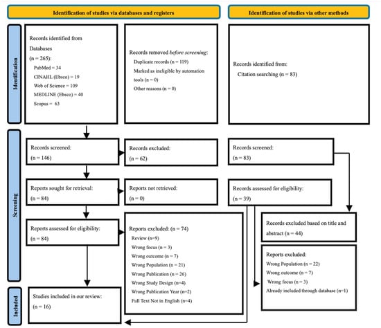 The initial database search retrieved 265 studies, of which 118 duplicates were removed. Two independent reviewers (Anonymized-for-Review_1, Anonymized-for-Review_2) screened the remaining titles and abstracts using Covidence, a web-based tool for systematic review management [20]. Any disagreements between reviewers during the screening or full-text review stages were resolved through discussion and consensus. A third reviewer (Anonymized-for-Review_3) was consulted when agreement could not be reached. Following title and abstract screening, 84 studies were selected for full-text review. In addition, backward citation tracking of 83 references was conducted to identify further eligible studies. After full-text screening and consensus between the two reviewers, 16 studies met the inclusion and exclusion criteria and were included in the review. Figure 1 displays the study selection process. Detailed search queries for all databases are provided in Table S3.