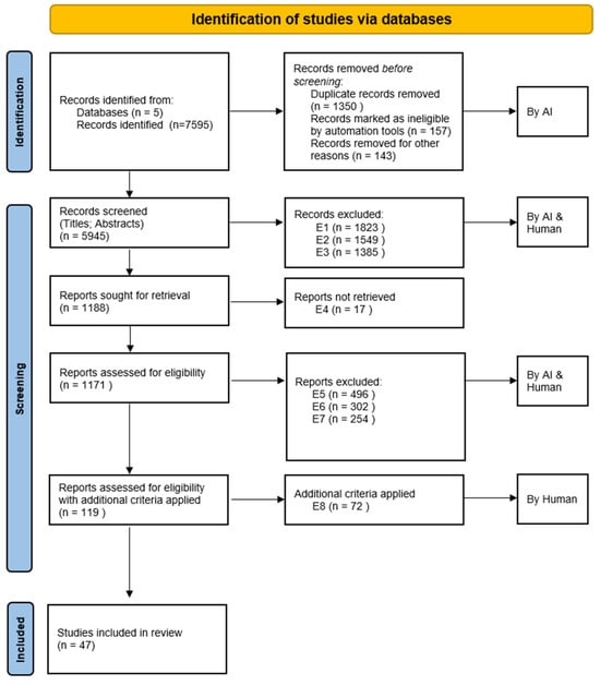 - Kitchenham, B.; Charters, S. Guidelines for Performing Systematic Literature Reviews in Software Engineering. Technical Report EBSE 2007-001, Keele University and Durham University Joint Report. 2007. Available online: https://www.elsevier.com/__data/promis_misc/525444systematicreviewsguide.pdf (accessed on 19 May 2025).