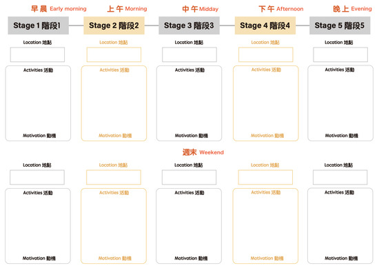User journey mapping template used in Stage 1 (labels translated from Chinese). Participants marked their daily activities and motivations across five time periods.