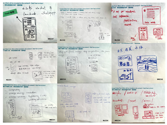 Examples of participant-generated hand-drawn communication materials from Stage 3, created with the assistance of a facilitator. Minor overlaps and incomplete text are present but do not affect the interpretation of the figure. Note. Drawings illustrate participants’ use of social media (WeChat, WhatsApp, Facebook), environmental symbols (trees, rivers), slogans (“Stop using fossil energy”), and traditional media (TV, radio).