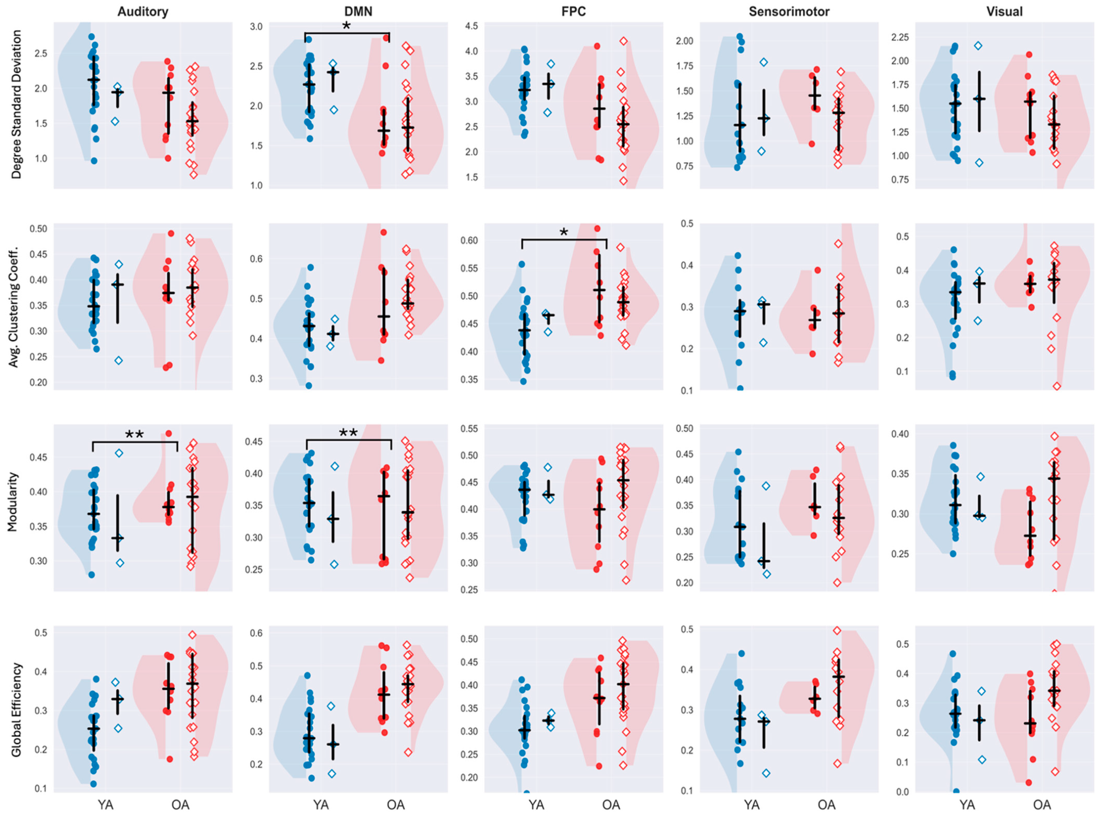 | Degree Standard Deviation | Average Clust. Coeff. | Global Efficiency | Modularity | ||