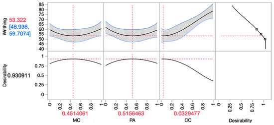 For this ternary combination, the predicted value for our response “writhing number” was: 53 writhings in the 30 min of the test. Those results were obtained with the desirability of 93%. Furthermore, the mixture profiler (Figure 4) visualized and optimized the response surfaces of the experiment where we show the response contours of the mixture experiment models on a ternary plot.