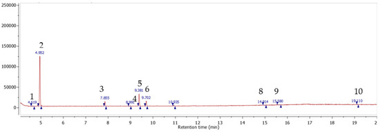 The mixture composition was analyzed through a GC/MC method dedicated to polar compounds identification the analysis revealed the presence of 10 compounds: (1) syringic acid; (2) coumarin; (3) gallic acid; (4) protocatechuic acid; (5) hexadecenoic acid; (6) kaempferol; (7) caffeic acid; (8) oleic acid; (9) trans-sesquisabinene hydrate; (10) cinnamic acid (Figure 5 and Table 2). Most of them are compounds known for their analgesic, antinociceptive and anti-inflammatory activities: syringic acid [11], coumarin [12], gallic acid [13], protocatechuic acid [14], kaempferol [15] caffeic acid [16].