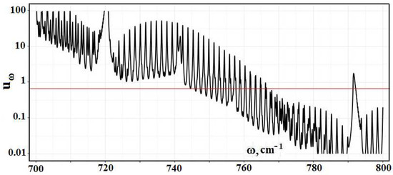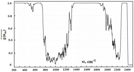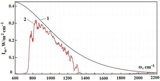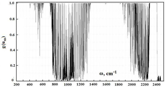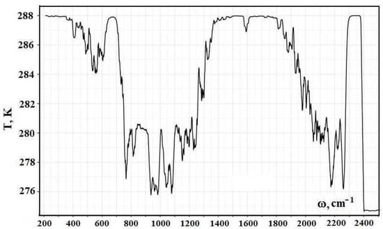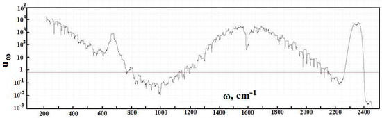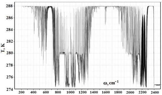 By analogy with evaluations [1], in subsequent calculations, we use information about radiative transitions from the HITRAN data bank. Figure 2 contains the frequency dependence for the optical thickness of the atmospheric layer between the Earth’s surface and clouds, which is determined by optically active atmospheric molecules in the infrared spectrum range. As it follows from this Figure, optical parameters of the atmosphere as a frequency function have a line character. One can determine from this the radiative temperature of molecules located in the atmospheric gap between the Earth and clouds, and its frequency dependence is presented in Figure 3.