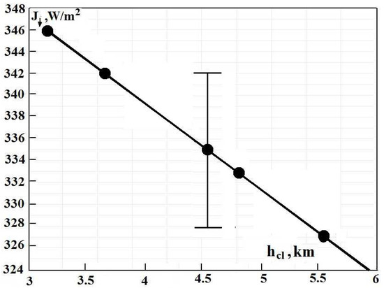 From Formulas (1) and (13), one can determine the radiative flux from the atmosphere to the Earth’s surface due to atmospheric molecules and clouds; this flux depends on the cloud temperature or the boundary altitude for clouds. This dependence is represented in Figure 8. In addition, these parameters are given in Table 1 for different versions of the energetic balance of the Earth and its atmosphere.