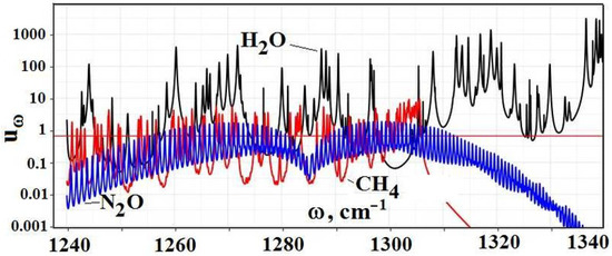 The number densities of these molecules at the Earth’s surface are taken from [47,48]. The absorption band for the molecule is (1240–1360) cm, the absorption bands for molecule are placed in the frequency ranges (1250–1310) cm and (2180–2260) cm. Figure 10 contains the partial optical thickness as a frequency function in the above absorption bands, due to individual greenhouse components, which include the above trace components and water molecules.