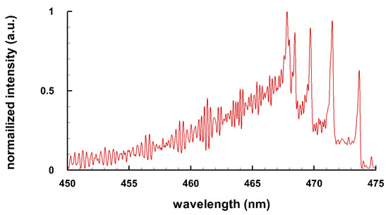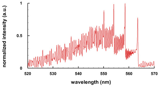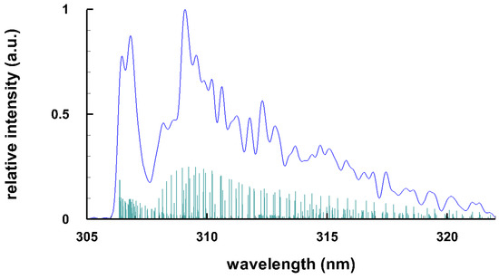Various reported studies of plasma spectra, including astrophysics plasma, and of molecular laser-induced breakdown spectroscopy (LIBS) [40,41,42,43] illustrate nice comparisons of recorded and of computed diatomic spectra. In LIBS, plasma generated by focusing coherent radiation is analyzed primarily in visible/optical or in near-uv to near-ir regions. After initiation of optical breakdown with typically 10 nanoseconds, 100 mJ laser pulses focused in standard ambient temperature and pressure (SATP) air or in gas mixtures [42], molecule formation including, for example, OH in air, C in carbon monoxide, and CN in 1:1 molar N:CO mixture, leads to recombination radiation that is typically measured using time-resolved optical emission laser spectroscopy. When using a metallic target, other diatomic molecules can be investigated, e.g., TiO or AlO, and molecular spectra can be computed from line strength data [40].