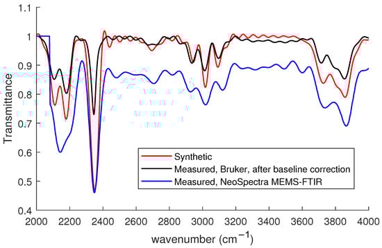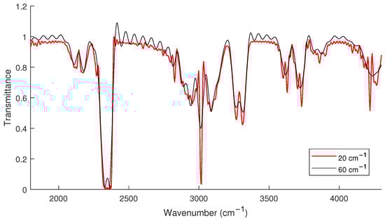 Without loss of generality, we execute experiments to scale up the resolution of the gas spectra from to . The range of wavelengths of our interest (relevant to the miniaturized FTIR spectrometers [39]) falls between 2000 and 4000 . This range of wavenumbers was chosen based on the supported range of the miniature MEMS FTIR device and based on the application under study related to the group of gases of interest for natural gas, biogas analysis and environmental monitoring. Infrared gas analysis with smaller wavenumbers can be needed in other applications such as industrial process control and medical diagnostics [40].