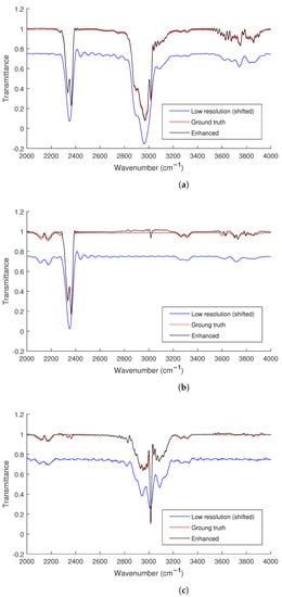 We first tested the trained data with a synthetic dataset of another 8000 synthesized spectrums. The test loss, calculated as in (7), was . Figure 4 shows the output of the trained CNN for two different examples of the test data. The network was able to construct the high-resolution spectrum with an average MSE identical to the test loss. The low-resolution (input) spectra in the figures was shifted by an amount of 0.25 for the sake of clarity. As can be seen from the figures, overall, the trained network performs well in resolving the overlapped peaks from the low-resolution spectra. As shown in Figure 4b,c, in some cases, (specially for lower SNR values), the noise in the low-resolution spectra are misidentified as peaks with small amplitude (e.g., the peak at ∼3000- in Figure 4b and the peak around ∼2350- in Figure 4c). The MSEs of these three examples were , and , respectively.