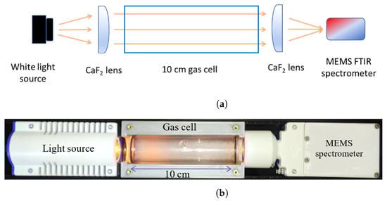 The synthetic data show the theoretical gas spectra; however, the measured spectra are affected by many background distractors, such as light sources and the gases in the surrounding atmosphere resulting in distortions in the measured spectrum. Additionally, other artifacts and nonlinearities affect the measured spectra from different devices. This includes non-constant baselines. Theoretical transmission spectra have all the spectral peaks ’dropped’ from horizontal baselines while the baselines of the measured spectra are affected by the device and the orientation of the gas cell, which cause them to have tilted baselines (see [41] and the figures therein). Additionally, non-uniform SNR commonly occur in miniaturized MEMS spectrometers, where the noise affects some wavelengths more than others. Also, the shape of the apodization function is another source of artifacts in the measured spectra. In this subsection, we discuss the performance of the trained network with real measurements. For the experiment, we measured the spectrum of a cell that contains a mixture of CO (), CO (), CH (1.2%) and HS () using both the bench-top device and a mid-infrared MEMS FTIR spectrometer at a resolution of 60 . The details of the measurement was as follows. A 10-cm length free-space gas cell filled with the gas mixture and sealed was specially ordered (from Wavelength References). The pressure inside the cell is the atmospheric pressure. The cell has wedged MgF windows transparent in the wavelength range of interest. The diameter of the cell is about 25 mm. The cell was measured using the setup shown in the schematic in Figure 5a, while a photo for the real setup is shown in Figure 5b with the light source switched on. An infrared light source (Thorlabs, HEP3965) was used. The light is collimated and focused using CaF lenses (Thorlabs) by placing them at a distance equal to their focal length away from the source and spectrometer input. A measurement background is taken while the two lenses are in close proximity. Then the gas cell is inserted and measured referenced to the background.