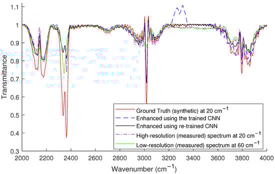 We note here that there is amplitude discrepancy between the synthetic spectrum and the high-resolution measured spectrum (as well as the enhanced spectrum). This is mainly due to distortions in the measurement process. The major difference in peak amplitude is encountered around 2400 and 3700 , the location of Carbon dioxide peaks. This indicates that the measuring process was affected by some factors such as the CO in the atmosphere or the measuring setup itself. A CNN model that is trained over synthetic data would not be able to mitigate this effect.