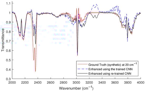 The predicted high-resolution spectrum from the MEMS FTIR measurement using the originally trained CNN is illustrated in Figure 8 (in blue dashed line) along with the ground-truth high-resolution spectrum.