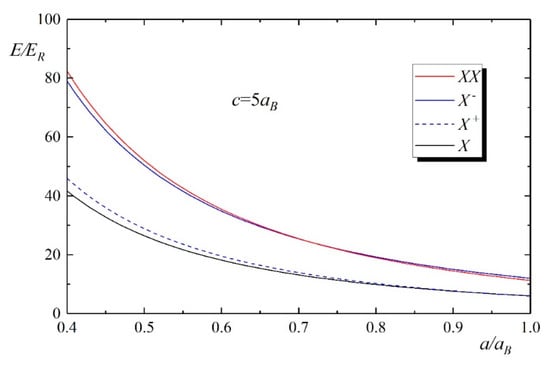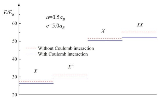 Let us proceed to the discussion of the results. In Figure 1, the schematic plot of the energy diagram has been shown for all excitonic complexes in comparison with the sum of energies of constituent particles, without taking into account Coulomb interactions between them, for the fixed values of the small and large semiaxes. This means that the energies are calculated as the simple amount of one particle energies with the help of Equation (6). For the exciton, it is one electron and hole; for biexciton two electrons and two holes; and one electron and two holes or two electrons and one hole, correspondingly, for positive and negative trions. Note that for all quasiparticles, the energies with the account of Coulomb interaction lay lower than the energies without Coulomb interaction. Interestingly, the energy of the positive trion is close to the exciton energy, and the energy of the negative trion is close to the biexciton energy. The regularity, that the negative trion energy is higher than the energy of the positive trion, is because consists of two electrons and one hole and consists of two holes and one electron. As the effective mass of the heavy hole is much more than the electron effective mass, the kinetic energy of the heavy hole will be much less than the electron kinetic energy.