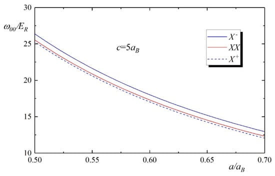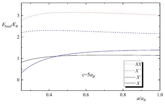 In Figure 3, the dependencies of the binding energies for excitonic complexes have been presented. The binding energy for the biexciton has the biggest value; consequently, the stability of the system in SPEQD obtains a high value. The exciton and negative trion binding energies are close to each other. Therefore, the binding energy of the positive trion lays between curves for exciton and biexciton. Binding energies of the biexciton and positive trion are the maximum, while the binding energies of exciton and negative trion monotonically increase with the increase of the small semiaxis. Although small values of the parameter, , correspond to the large values of size quantized energy for constituent particles, nevertheless, the Coulomb interaction also increases due to the proximity of particles. That is why the curves of binding energies for all quasiparticles begin to descend with the decrease of a small semiaxis.