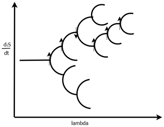Bifurcation diagram showing how, for non-linear non-equilibrium systems, two, or more, solutions suddenly appear at what is known as a bifurcation for a particular parameter of the system (which may be, for example, the strength of the external force over the system). Which branch the system takes depends on microscopic fluctuations (either externally or internally induced) and their “reinforcement” by the applied external potential (stronger in the direction of greater dissipation, i.e., increases ). If positive feed-back (e.g., auto- or cross-catalysis) is present, many states of greater entropy production will be available (e.g., concentration profiles of dissipatively structured molecules floating on the ocean surface which increase the dissipation of the incident photons [13]). This leads to a unique “history” for the system, generally, but not always, through states of ever greater entropy production. The dotted arrows represent the direction in entropy production taken by the system due to the fluctuation which prevailed at a particular time in the systems evolutionary history. This probabilistic selection through the different locally stable stationary state solutions towards ever greater entropy production is what we have termed thermodynamic dissipative selection. Taken with permission from [12].