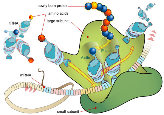 Diagram of the cell organelle ribosome where genetic information is converted into proteins. This process occurs at the submicron scale, implying the existence of microscopic dissipative structuring. Molecular motors are another example of micrscopic dissipative structuring. Image credit: LadyOfHats, Public Domain.